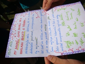 Dnes došlo k velmi zvláštní situaci. O poledním klidu jsme dostali od alchymisty zprávu, že je nezbytné, abychom my, dospělí, opustili tábor. Samozřejmě se nám nechtělo nechat samotné děti v táboře. Alchymista nám ale řekl, že viděl budoucnost a že se nemusíme bát, protože to děti zvládnou. Tak jsme plni obav odešli z tábora do nedalekých lesů. Děti v táboře si zpočátku nevšimly, že tu nejsme. Ale již po chvíli byly slyšet hlasy nejstarších dětí, jak svolávají oddíly a vydávají svačinu. Děti si všimly, že tu zůstala zdravuška. Snažily se z ní vytáhnout nějaké informace, ale nepovedlo se jim to. Pak kluci našli dopis, ve kterém bylo napsáno, že jsou dospěláci pryč a do večerky si musí poradit sami. Junioři zareagovali naprosto úžasně. Rozdělili si, kdo co bude dělat. Někteří si vzali na starosti oddíly, pohotově začali připravovat a hrát hry. Pečlivě hlídali, aby měli všichni čepice a často pili. Holky se chopily mytí nádobí po svačině a omývání hrnečků ( což mě překvapilo nejvíc). Ostatní přemýšleli, co budou s táborem dělat po večeři. Napadlo je, že upořádají táborák a vymysleli k němu celovečerní program. ( Na něj nakonec nedošlo, ale těšíme se, že nám ho ukáží jiný večer.) Odpoledne uteklo jako voda. Junioři v šest svolali nástup. Po pár minutách si děti všimly neobvyklého pohybu. A pak to přišlo. Dospěláci i děti měli radost, že jsou zase spolu. Všichni se objímali a radovali. Děti měly radost z návratu oddíláků a oddíláci byli pyšní na své děti, jak úžasně to zvládly. Sama za sebe jsem ráda, že jsme tuto hru hráli. Dokázali jsme tím, že dnešní děti jsou stejně úžasné a zodpovědné, jako děti před více než deseti lety, kdy se tu tato hra hrála naposledy. Po celou dobu jsme tábor sledovali z lesa a drželi jsme dětem palce, abychom hru nemuseli přerušit a náhle se vrátit. Jsem na "NAŠE DĚTI" pyšná, Míša Vališková